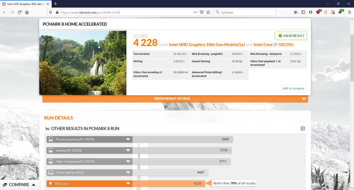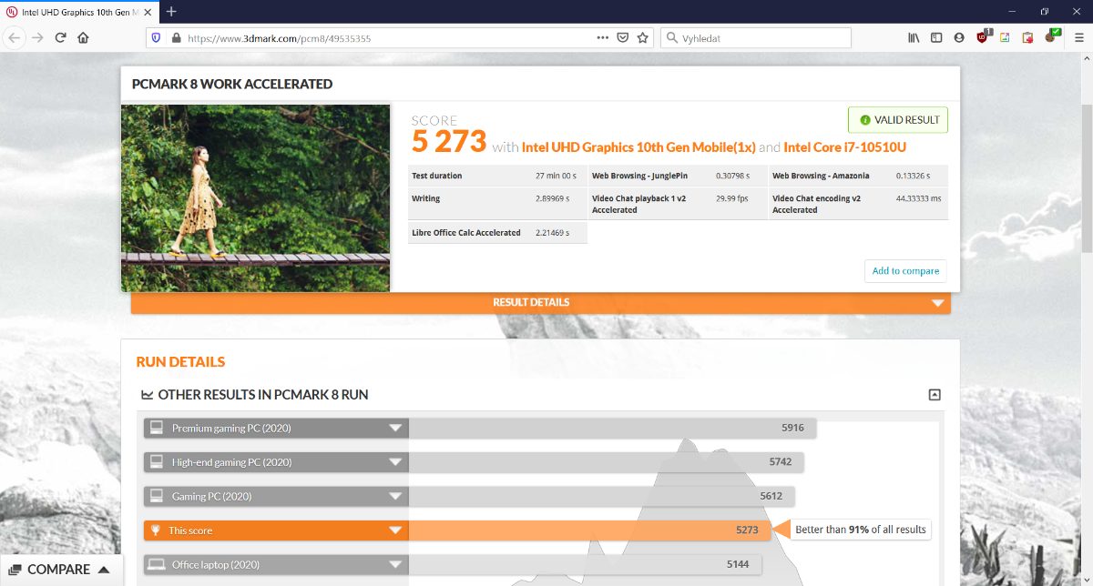 Jak jsem zmiňoval v recenzi ThinkPad T14s Gen 1, výkon procesoru Core i7-10510U se oproti starším generacím příliš nezvýšil. Ve srovnání s procesory Intel Core 8. generace (např. ThinkPad T480) se reálný výkon CPU zvýšil o cca 10–20 %. Zařízení má stále dostatek výkonu na všechny běžné činnosti (web, práce s dokumenty, základní multimédia), v případě větší zátěže ale mohou přijít vhod spíše konfigurace s procesory AMD Renoir, které díky použití šesti a osmijádrových CPU dle prvních zahraničních recenzí dle očkeávání nabízí podstatně vyšší výkon při využití více jader CPU (až o cca 40 %!).