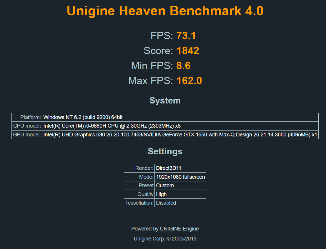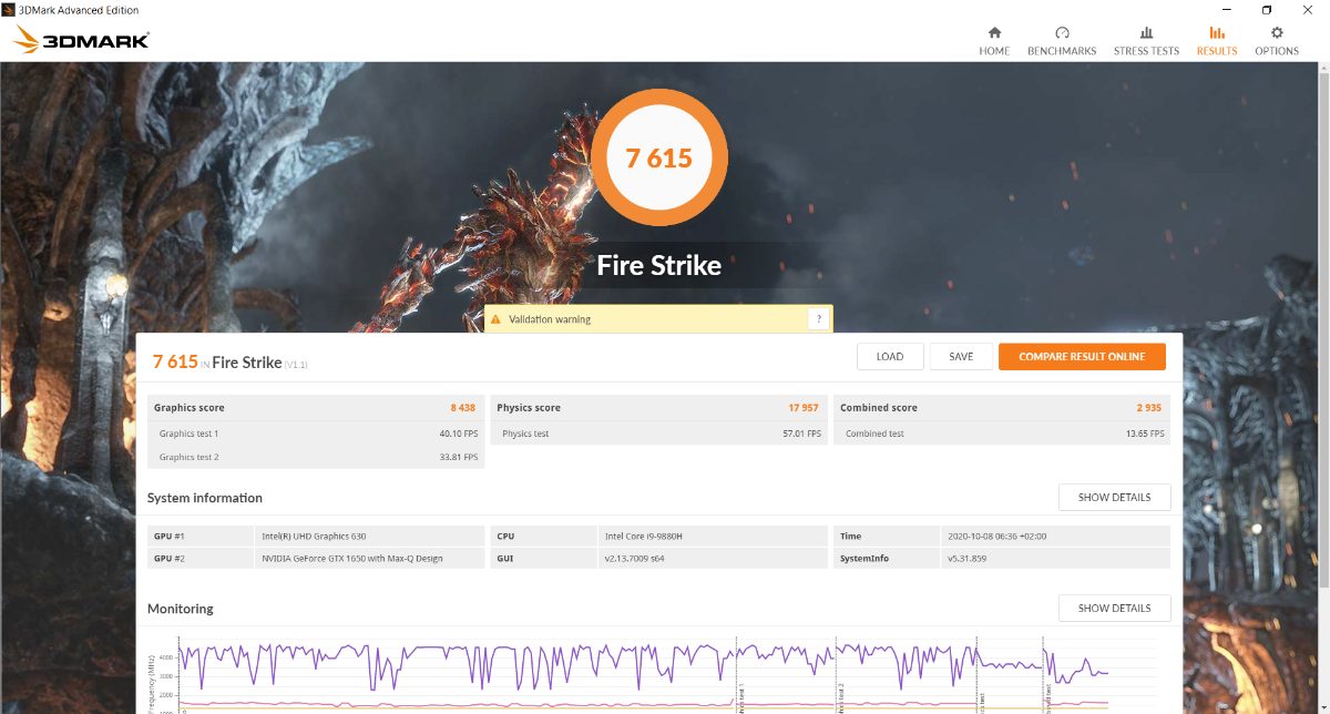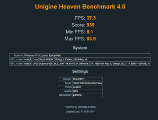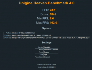 Tento test dává rámcovou představu o chování komponent při hraní her. Při půlhodinové zátěži dvou vláken CPU (Prime95 v režimu Blend) a grafické karty (FurMark při rozlišení 1 920 × 1 080) se takt CPU držel při ~2,6 GHz (což je o chlup nad výchozím taktem 2,3 GHz) a teplotě ~80 °C. Grafická karta NVIDIA běžela stabilně na plný výkon (~1,1 GHz) s teplotami kolem 73 °C. Krátkodobé nárazové snižovaní výkonu grafiky jsem nezaznamenal. To je v rámci své třídy dobrý výsledek, ale dokládá to, že rychlý procesor zde slouží především pro krátkodobou zátěž: umožňuje rychle spustit i náročnější programy, v konstantní zátěži ho ale limituje tenké tělo notebooku a s tím spojené omezené chlazení. Z pohledu běžného uživatele to ale ničemu nevadí.