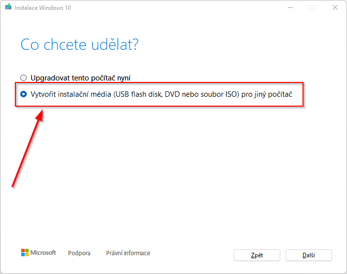 4. Na stránce „Co chcete udělat“ vyberte možnost „Vytvořit instalační média…“ a pokračujte dále.2