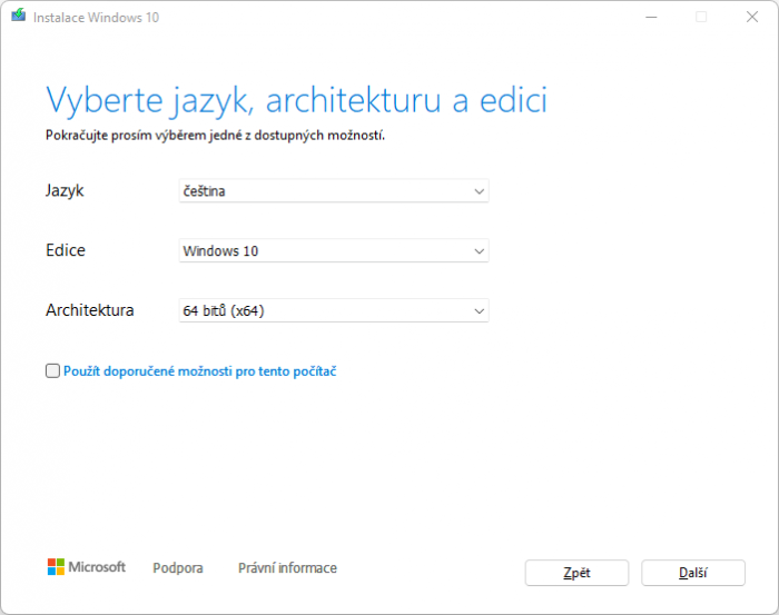 5. Na další stránce nastavte jazyk na češtinu, edici ponechejte Windows 10 a architekturu 64bitů.3