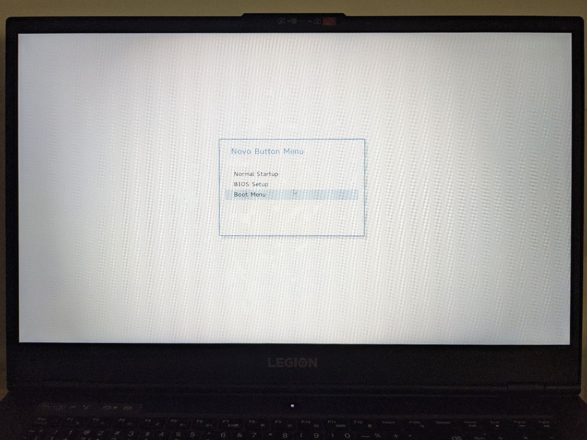 Nyní můžeme systém nainstalovat. Připojte notebook na nabíječku a vložte do volného USB konektoru flash disk. Nyní spusťte notebook stiskem tlačítka Novo – tedy nikoliv standardním tlačítkem pro zapnutí notebooku. Pozici tlačítka Novo naleznete v uživatelském manuálu, který je v balení, případně na stránce https://support.lenovo.com/. Tlačítko Novo je zapuštěné, takže k jeho zmáčknutí bude potřeba použít nějaký tenký předmět, třeba jehlu k otevření šuplíku na SIM kartu, nebo i špendlík.