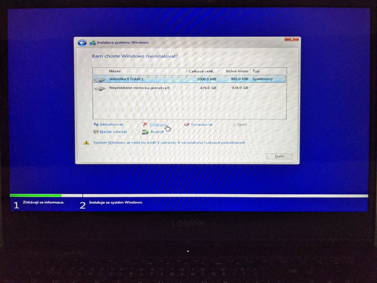 Pokud se po restartování zobrazí úvodní obrazovka z instalace systému, vyjměte flash disk, notebook natvrdo vypněte a poté opět zapněte. Instalace pak bude pokračovat.