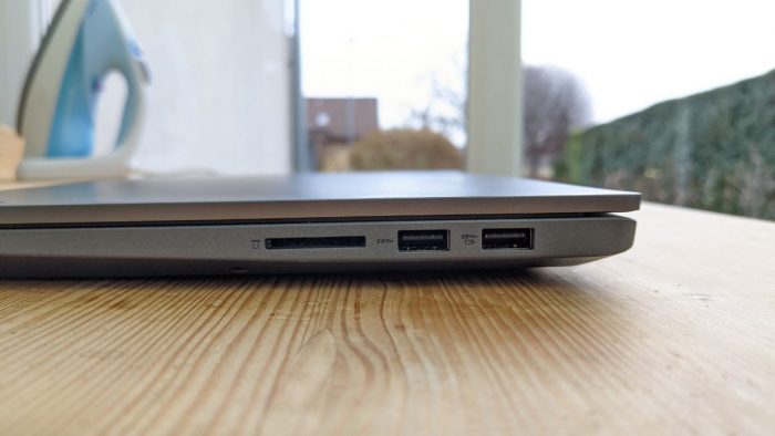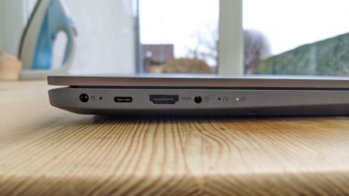 Na levé straně proto nalezneme 3,5mm jack, HDMI 1.4, USB-C (ve verzi 3.2 Gen 1 – podporuje PowerDelivery 3.0 a DisplayPort 1.4) a testovaný kus měl ještě speciální konektor pro nabíjecí adaptér. Ten na prodejních kusech neuvidíte; nabíjení je realizováno přes USB-C.