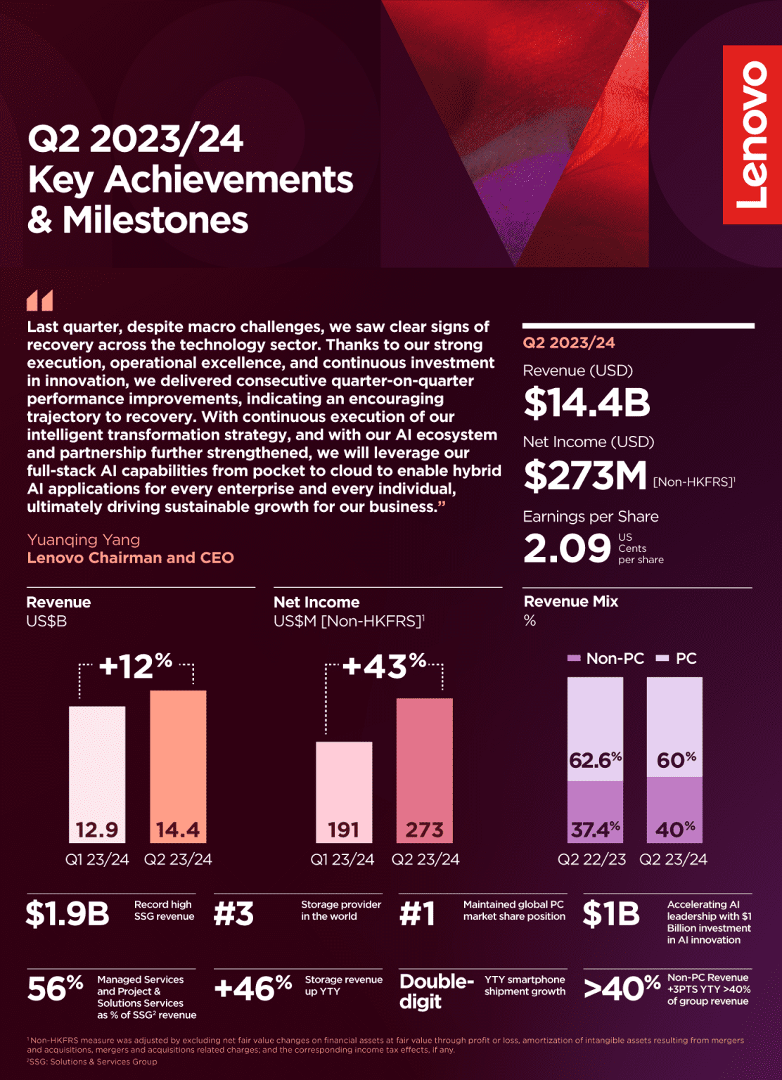 Předseda představenstva a CEO Lenovo Group, Yuanqing Yang, poukázal ve svém komentáři na jasné známky oživení technologického sektoru, i přes makroekonomické potíže. Zdůraznil zlepšení výkonnosti firmy ve 2 po sobě jdoucích čtvrtletích díky silné exekuci, provozní důslednosti a neustálým investicím do inovací. Vyjádřil proto optimismus co do trajektorie zotavení. Příležitost vidí v AI: „Díky nepřetržité exekuci naší strategie inteligentní transformace a dalšímu posilování našeho ekosystému a partnerství v oblasti AI, budeme nadále podporovat naše komplexní schopnosti v oblasti AI od kapesních systémů až po cloud, abychom každé firmě a každému jednotlivci umožnili využívat hybridní aplikace AI, což v konečném důsledku povede k udržitelnému růstu našeho podnikání.“
